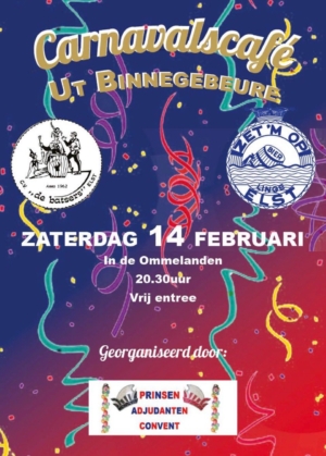 Een gezellige knipoog naar het bekende Ut Buutegebeure op carnavalsdinsdag, maar dan binnen én ’s avonds. Verwacht een avond vol sfeer en heerlijke (Elster) carnavalsmuziek.